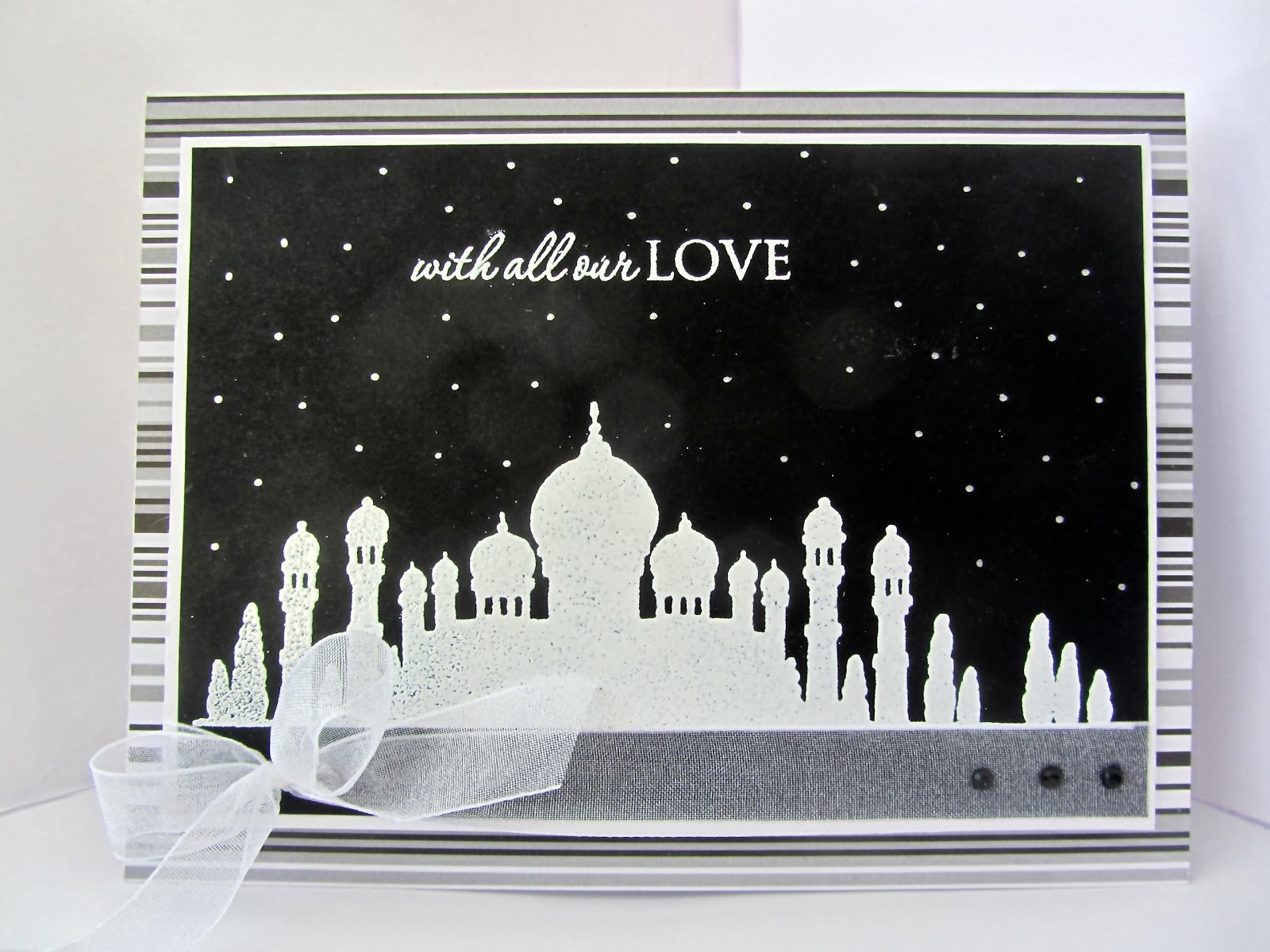 | The focal image of the Taj Mahal ( I think!) is from Chocolate Baroque's Indian Textiles set, heat embossed in white onto black CS. The sentiment is also heat embossed. I am quite pleased with the crisp white embossing, very striking against the black. With a silver sharpie I also added some stars to the sky. To finish this simple card, some sheer white ribbon and three black bling. And finally I used foam tape to adhere the embossed panel onto the stripy background paper which is called Liquorice Sherbet by Papermania. |