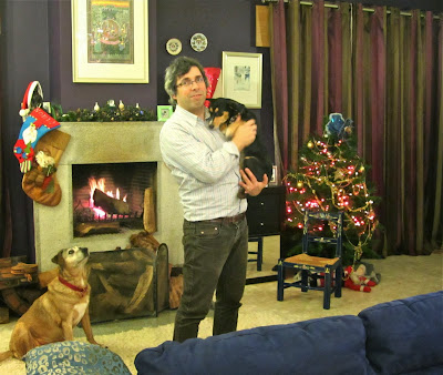 By the evening we kissed and made up. Here is hubby engaged in a reconciliatory cheek to cheek with the culprit, Peanut. How can this 7kg (15.5 lb) shortcake cause such chaos?! I didn't bother putting the tree back in order...not on the last day. Needless to say, it will be the subject of Peanut's First Christmas....for many years to come.