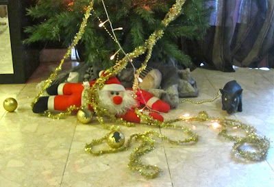 | Santa flat out (how did he get there?!), broken baubles, tinsel & lights all over the place AND a black pig! Wonder who's behind this hot mess?! |