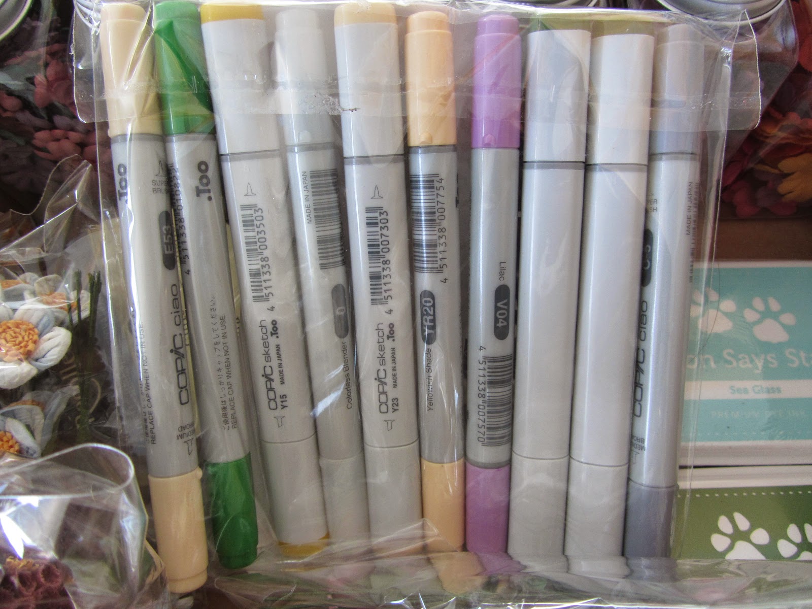 That box she sent has the prettiest flowers, ribbons, stamp pads and a bunch of Copic markers!!! If that weren't enough.... she also sent a 12" cutting mat!