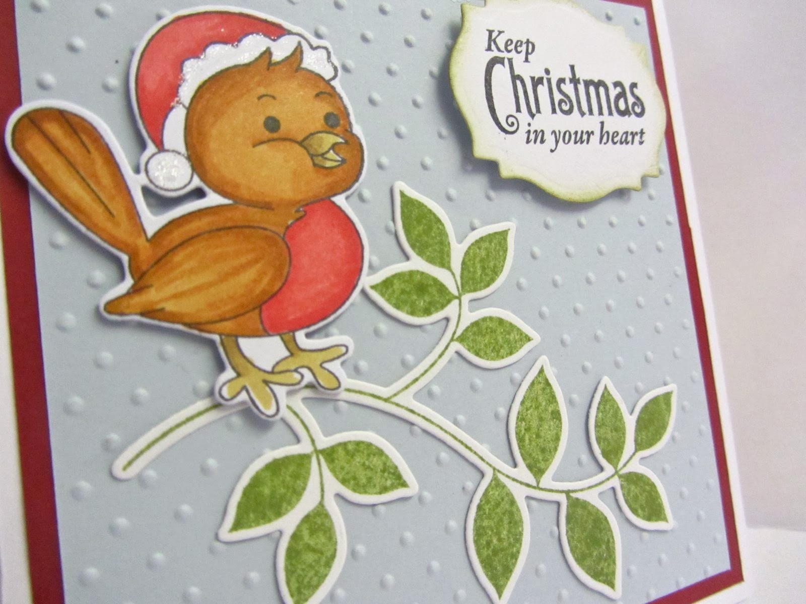 The bird is from Clearly Besotted's Merry Little Christmas set. I coloured him with Graph It markers. The background is embossed with the Swiss Dots folder.