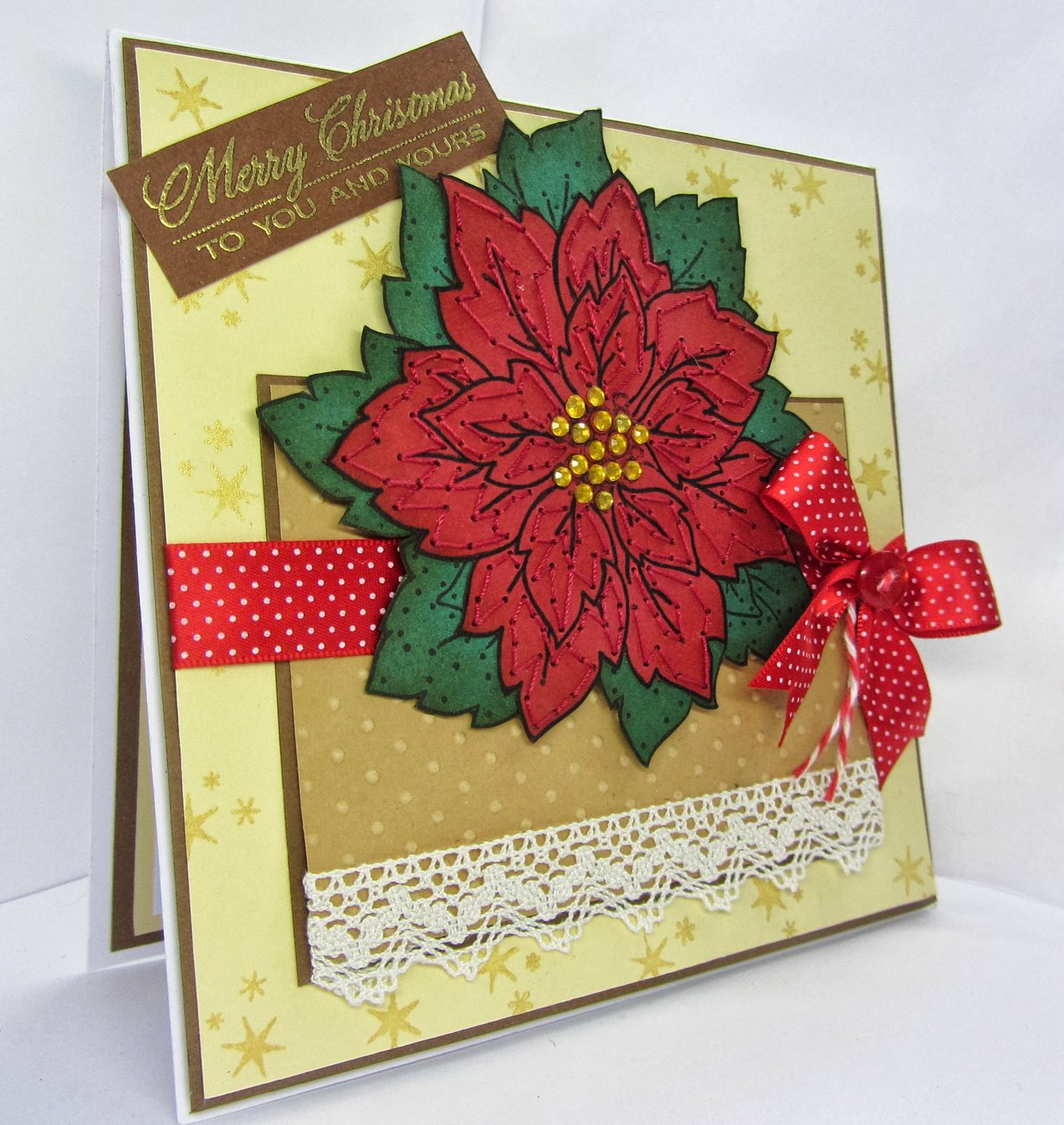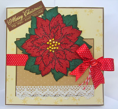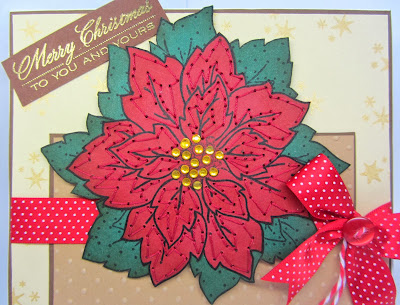 | Here's a close-up of the poinsettia. I stamped it directly on coloured CS with Memento Tuxedo Black. Then I applied TH's distress inks. The little black dots are the stitch points. All you have to do is poke 'em and stitch 'em. I finished it with some yellow bling in the centre. The greeting is from WMS A Cottage Christmas, heat embossed in gold. |