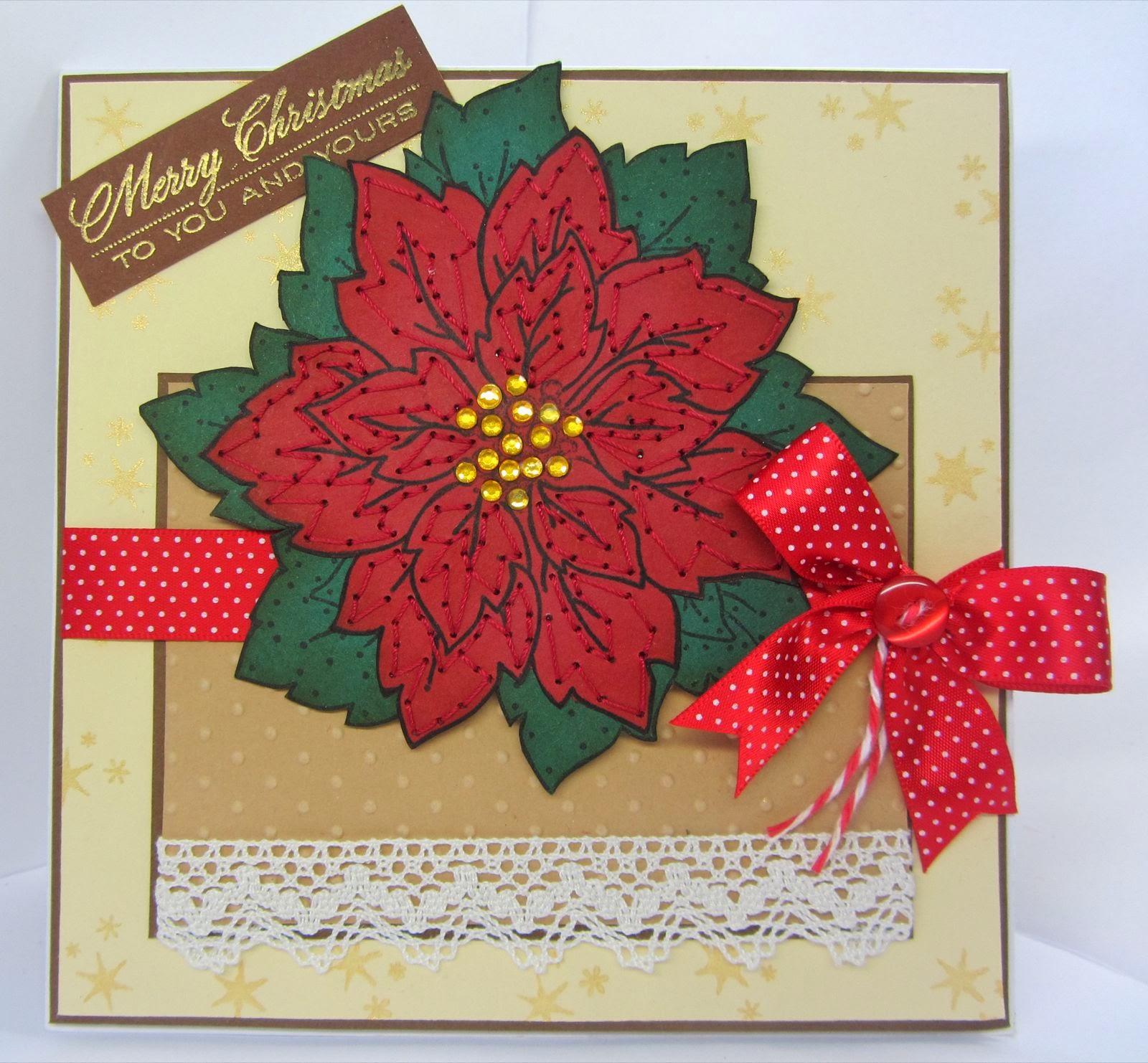| The star of this show is from a stamp called Poinsettia Stamp n Stitch by Chocolate Baroque. Sadly this stamp has been discontinued. I think it's just lush and gorgeous! |