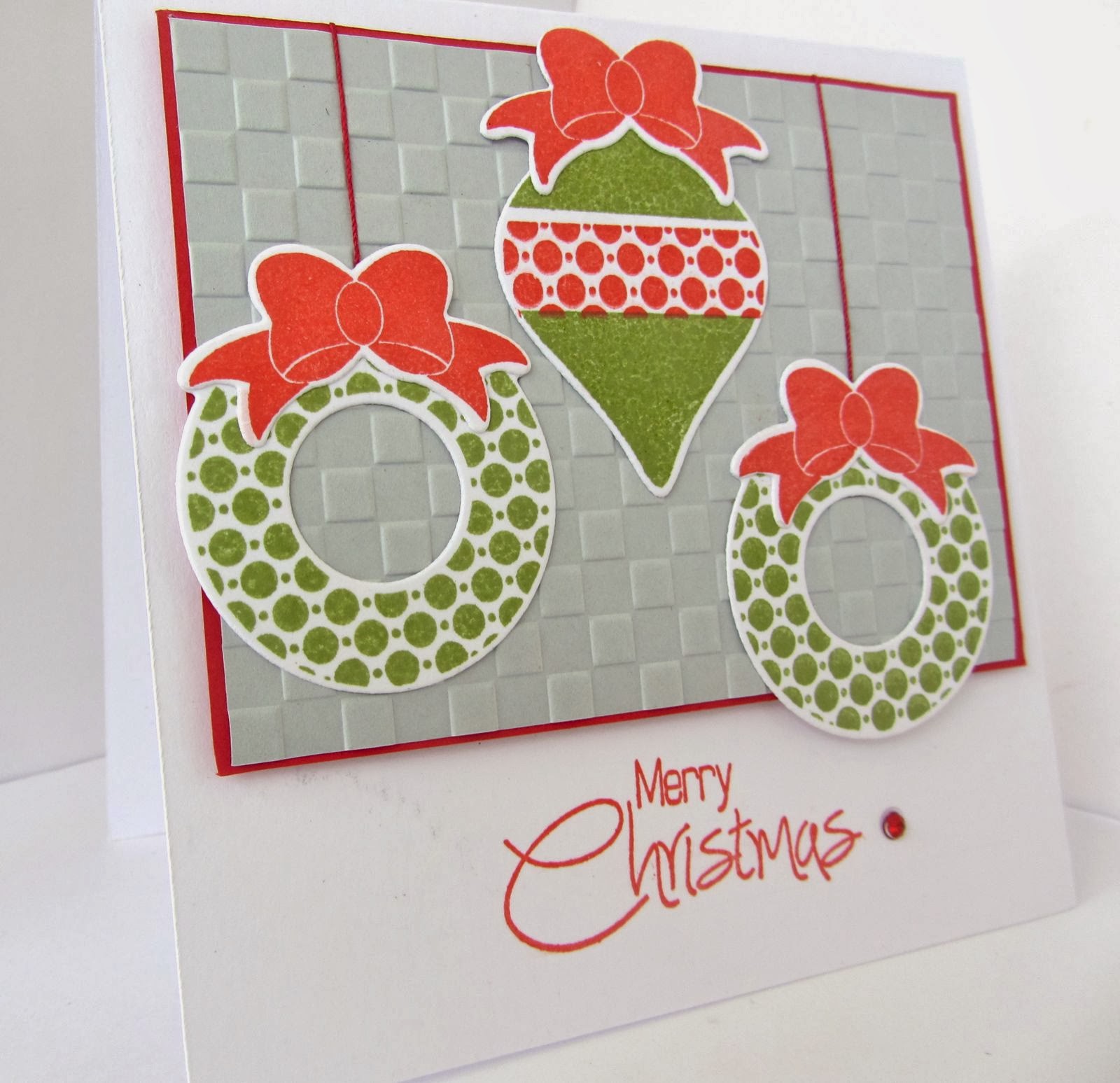 | I embossed the green panel using Checkered folder and the white vellum using the Swiss Dots folder. Embellishments: sheer white ribbon, clear bling and white Liquid Pearls. The image and greeting are from Chocolate Baroque's Christmas Cheer. |